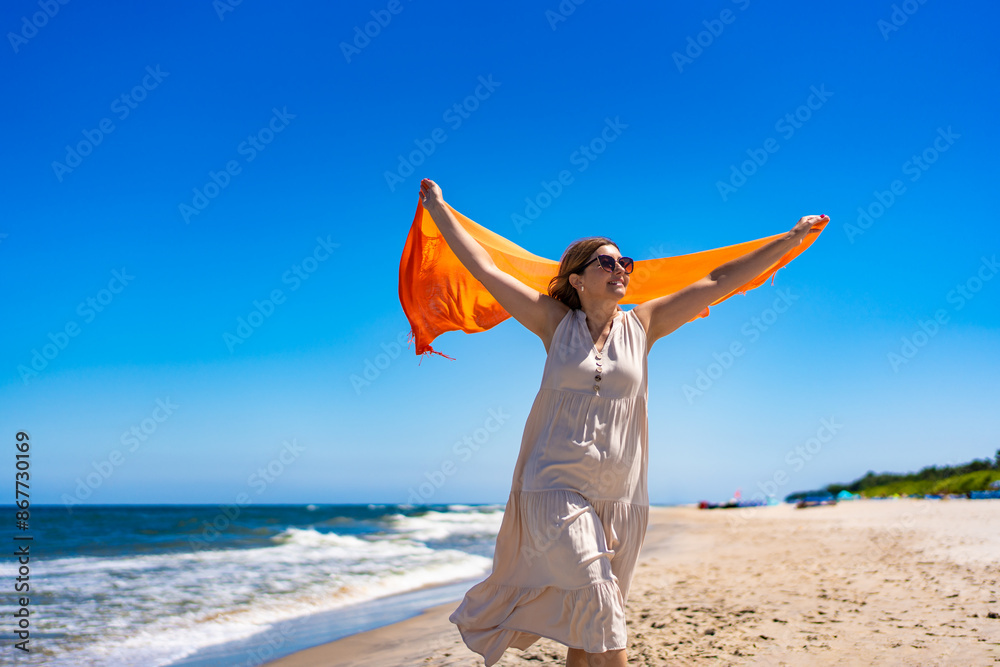 Summer vacation. Beautiful young woman in beige dress and sunglasses holding orange scarf fluttering in the wind walking on the sandy beach by the sea with big waves on a beautiful sunny day