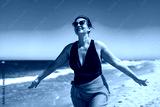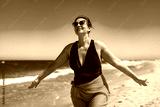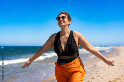 Summer vacation. Beautiful young woman in black swimsuit and orange scarf and sunglasses walking with her arms raised up on the sandy beach by the sea on a beautiful sunny day