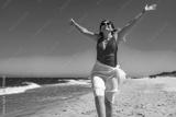 Summer vacation. Beautiful young woman in red swimsuit and white scarf and sunglasses walking with her arms raised up on the sandy beach by the sea on a beautiful sunny day