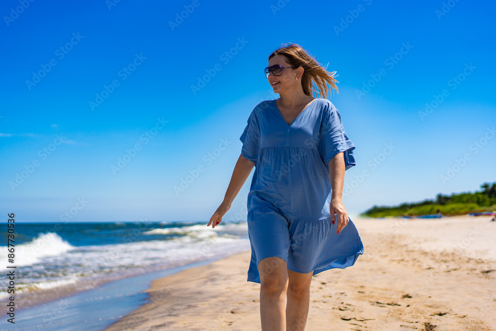 Beach vacation. Happy young woman wearing fashionable blue dress, walking on sunny sandy beach on windy day