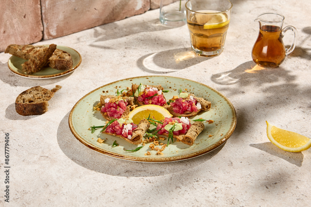 Delicious Tuna Tartare on Toast Set Against a Natural Beige Table in Sunlight and Shadows