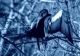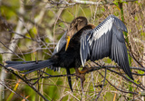 Beautiful Anhinga bird with out-stretched wings preening.