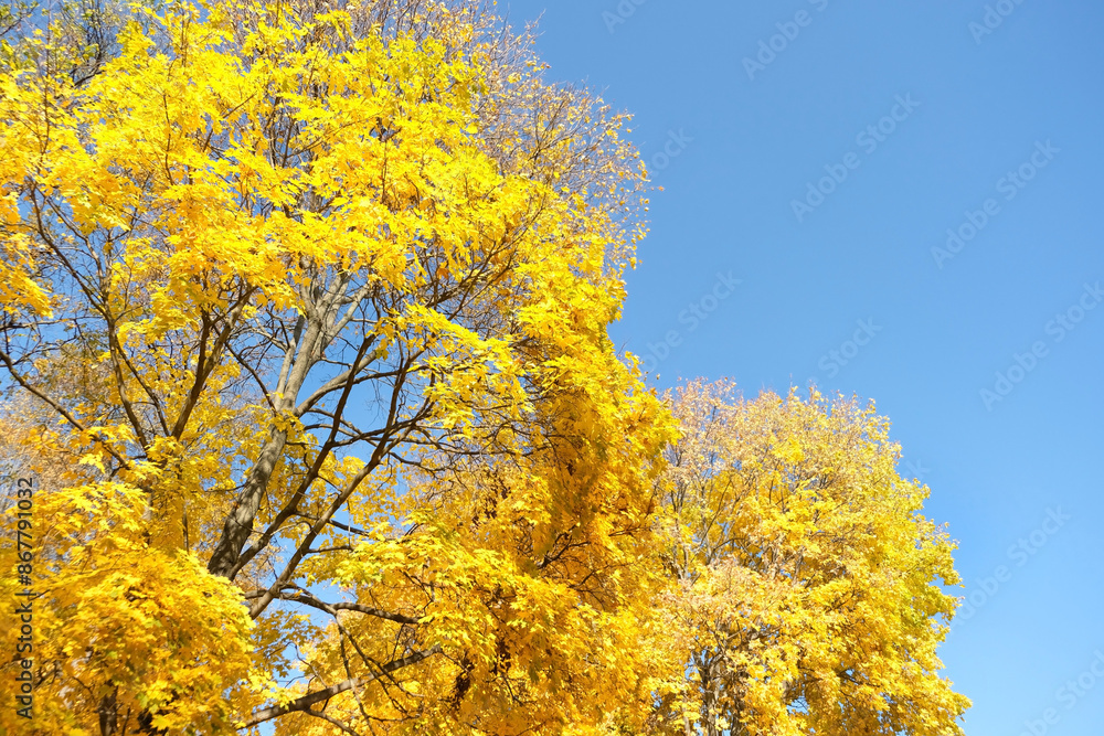 autumnal trees and blue sky, natural forest background. beautiful autumn landscape with bright yellow foliage of maple trees. fall time concept. artistic nature image. relax, harmony atmosphere