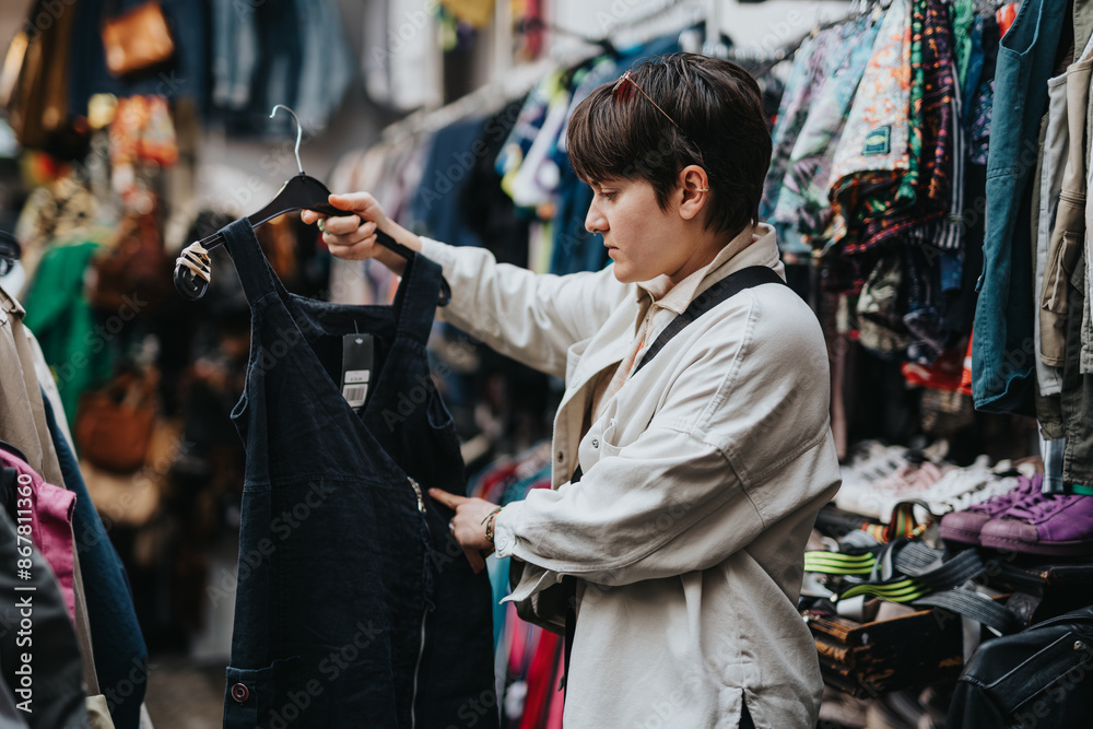 A person shopping in a thrift store, closely examining a black dress. The scene captures the experience of exploring secondhand clothing.