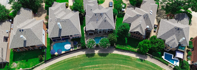 Panorama view swimming pool houses near golf course upscale residential neighborhood East of Plano, Texas, Dallas Fort Worth metroplex, grassy country club, large two-story backyard, aerial view