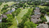 Club cars in large golf course community, luxury mansion houses with concrete tiles roof East of Plano, Texas, Dallas Fort Worth metroplex, upscale residential area new development home, aerial