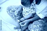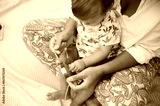 Top view: mother hugging her baby while he plays with educational wooden toys. A cute boy touches a chain with wooden pendants and studies new objects by touch. Motor skills development concept