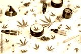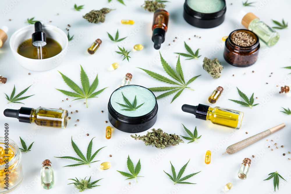 Cbd products. marijuana and cannabis hemp oil. flat lay, top view