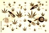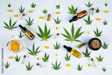 Cannabis leaves with marijuana, cbd, Flat lay composition