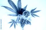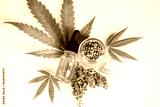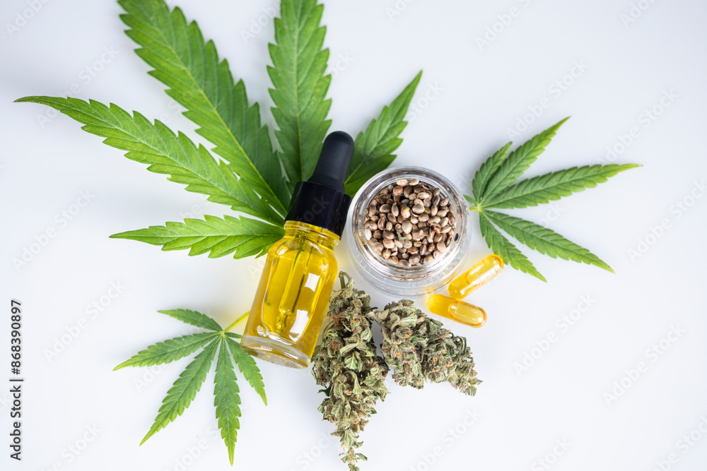 Hemp oil bottle with hemp leaf and cannabis leaf, marijuana