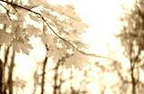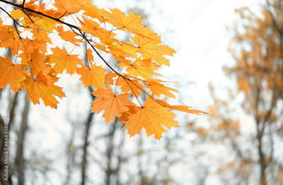 autumn nature background. yellow-orange maple leaves on branch, beautiful autumnal seasonal landscape. symbol of fall time. copy space