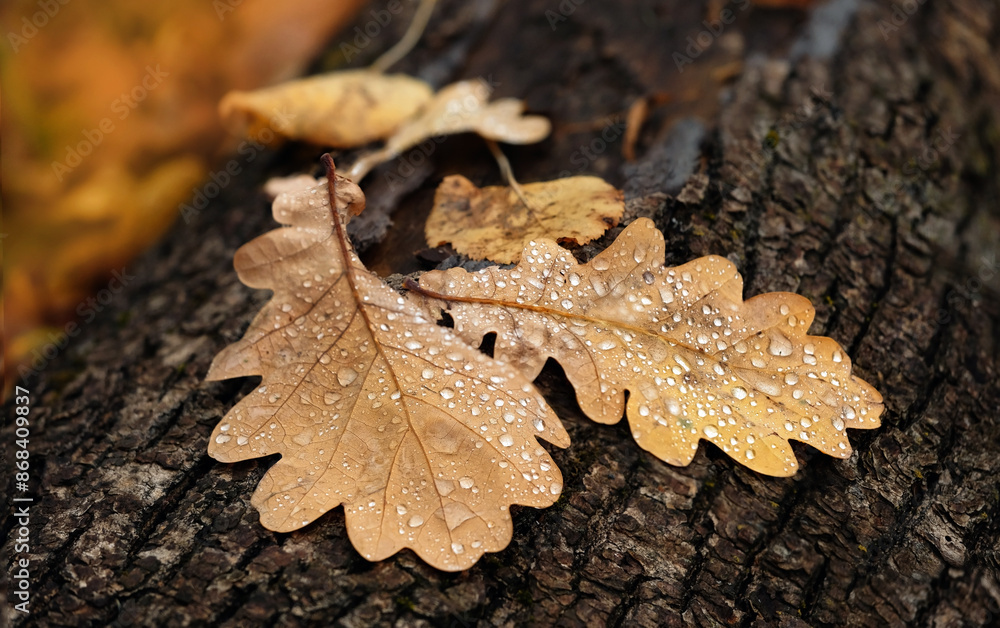 Autumn background. Fallen oak leaves with rain drops close up in forest, abstract natural backdrop. symbol of autumn season. fall time. template for design