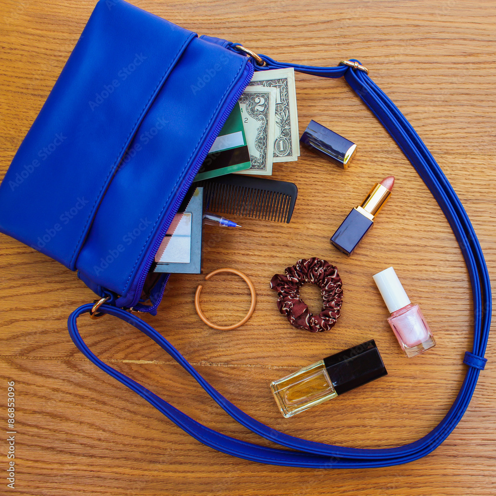 Things from open lady handbag. women's purse on wood background. Cosmetics and women's accessories fell out of the blue handbag.