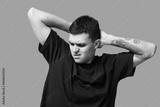Handsome young man feeling bad smell from armpits on beige background