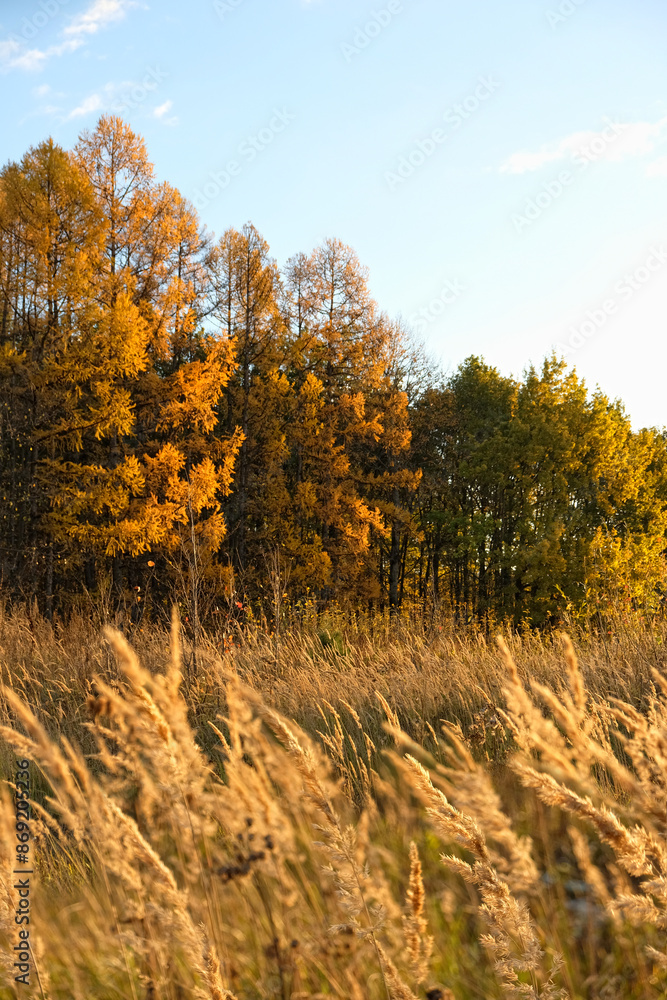 beautiful autumn nature background. colorful autumnal landscape with forest, dry grass and blue sky. fall time concept.