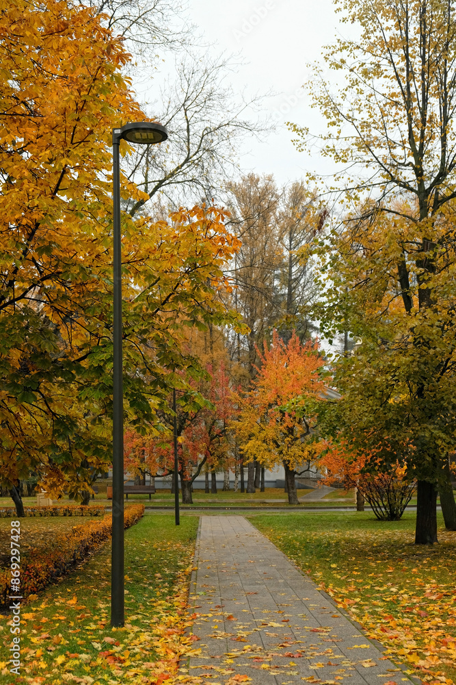 beautiful autumn nature background. landscape with autumnal trees and lantern in park, rainy day weather. fall time concept.