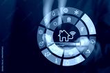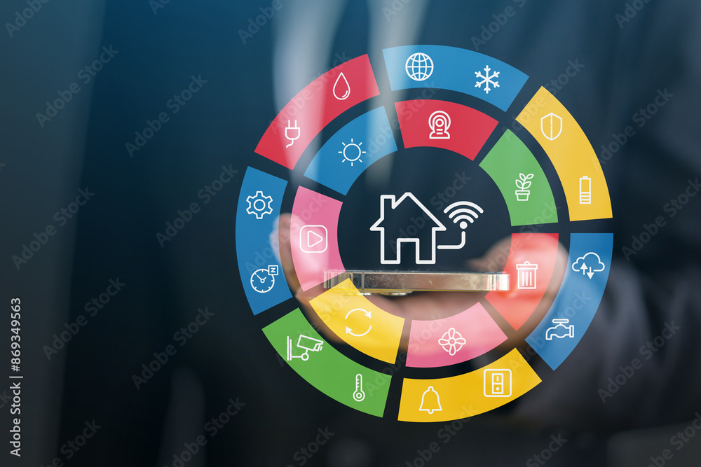 Human manage home remotely futuristic depiction of smart home technology, security and home appliances, concept of integrated smart home system, IoT, home automation and household management concept