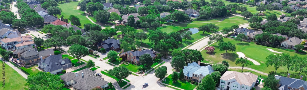 Panorama aerial view suburban park ample grassy space in upscale neighborhood area row of two-story mansion homes swimming pool, golf course community North Plano, Dallas Fort Worth Metroplex