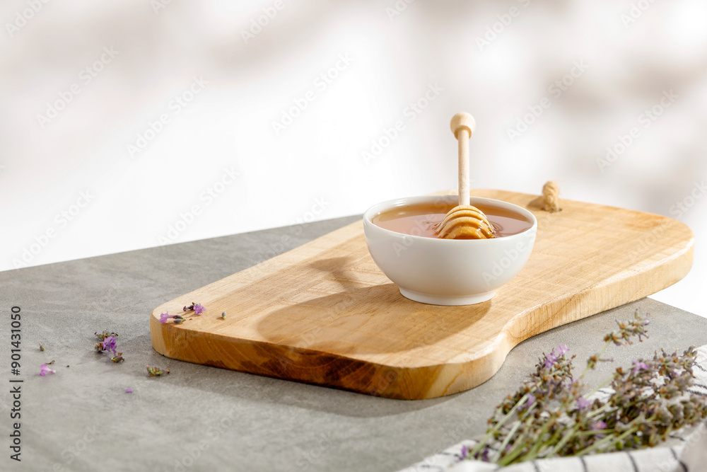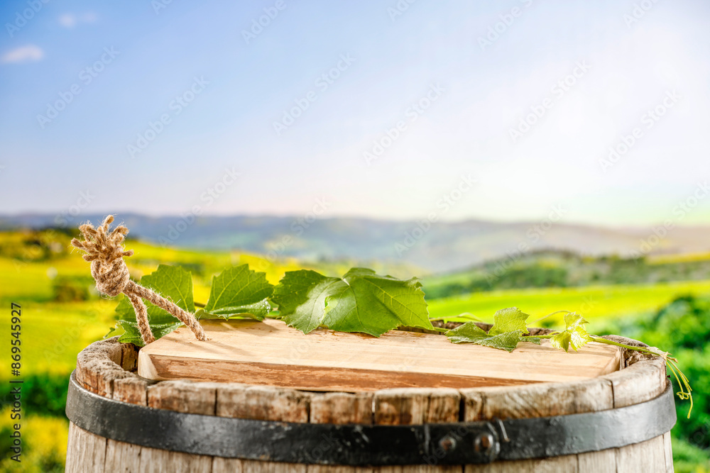 Empty wooden cutting board on old wooden wine barrel with copy space and vineyard background.