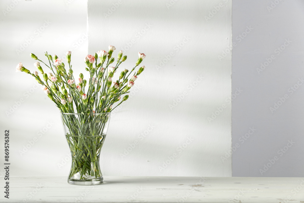 Bouquet of carnations flowers in a glass vase with white wall with natural sunlight bacground. Copy space.