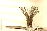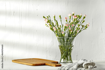 Bouquet of carnations flowers in a glass vase with white wall with natural sunlight bacground. Copy space.