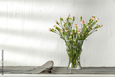 Bouquet of carnations flowers in a glass vase with white wall with natural sunlight bacground. Copy space.