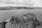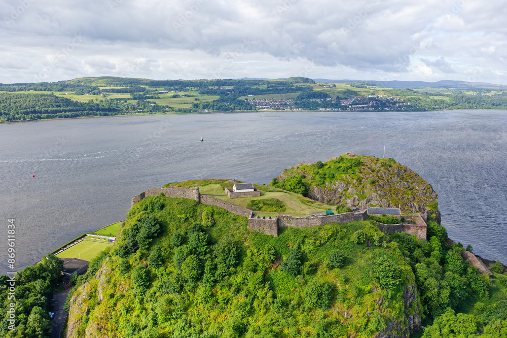 Dumbarton castle building on volcanic rock aerial view from above Scotland