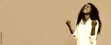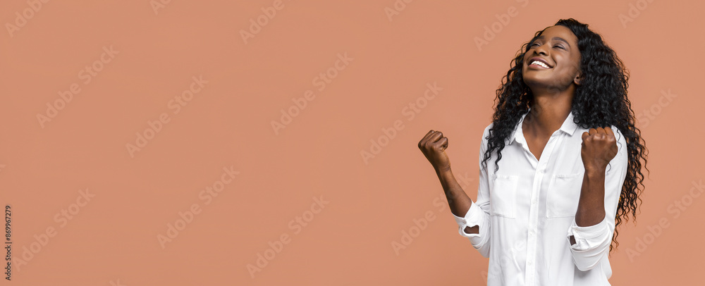 A young Black woman is celebrating her success. She is wearing a white shirt and has her arms raised in the air with her fists clenched. She is smiling and looking up towards the sky.