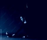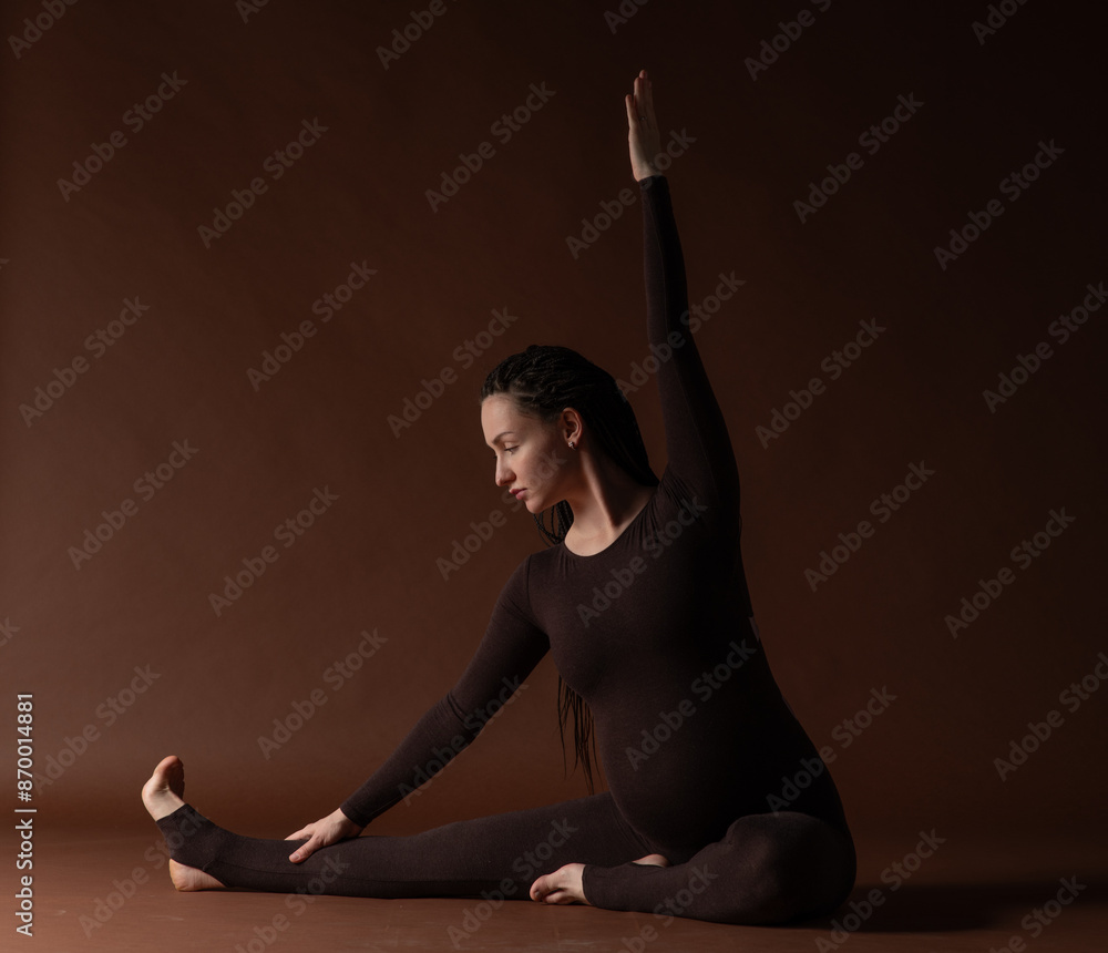 pregnant woman meditates and performs yoga exercise poses on a dark background