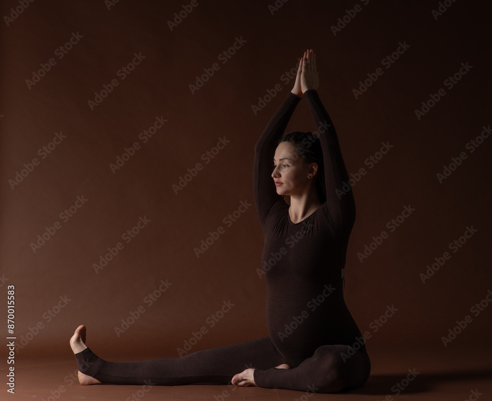 pregnant woman meditates and performs yoga exercise poses on a dark background
