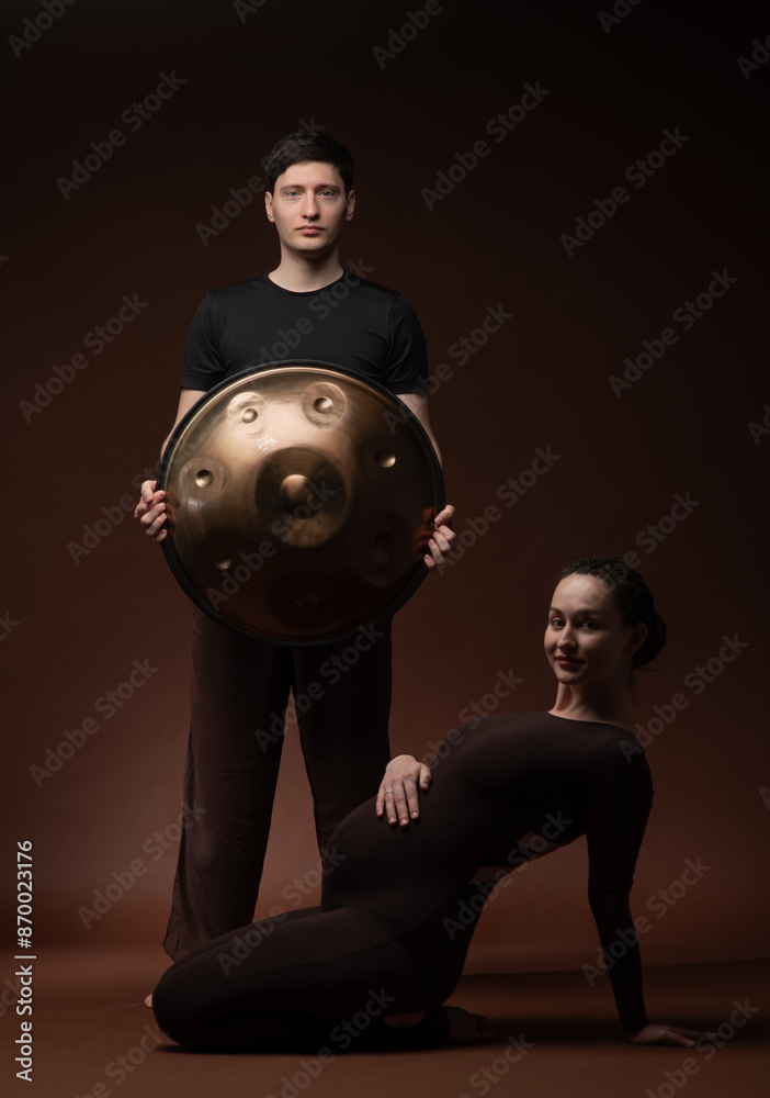 beautiful full-length portrait of a pregnant yoga woman with a partner on a dark background