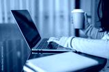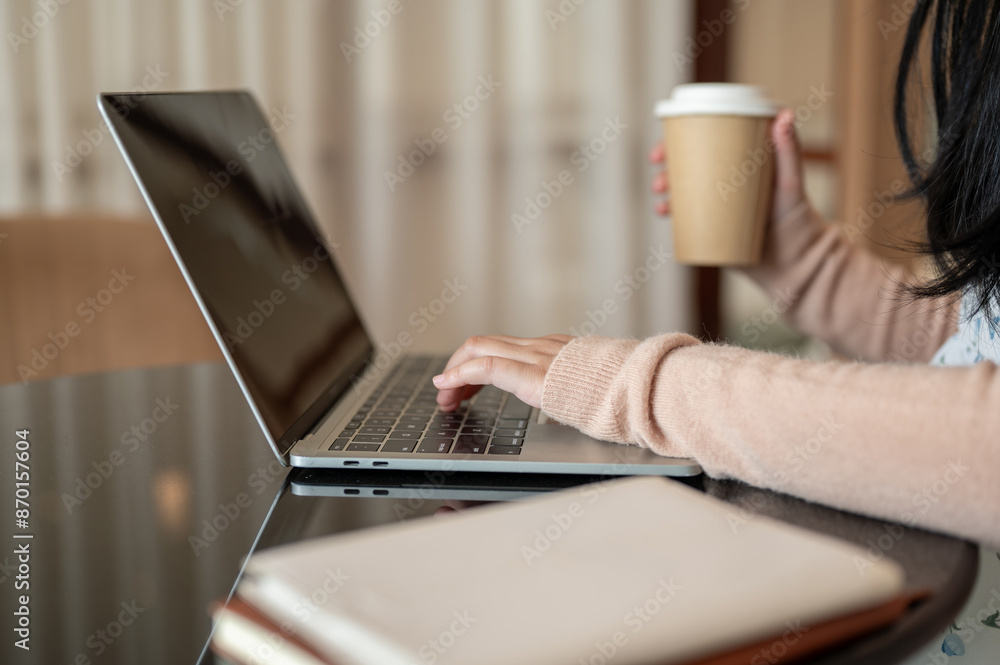 A cropped image of a woman working on her laptop computer and having a hot drink at a table indoors.