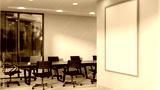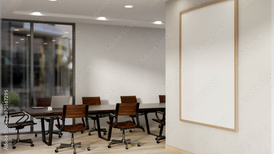 A large blank picture frame mockup on the white wall in a contemporary meeting room.