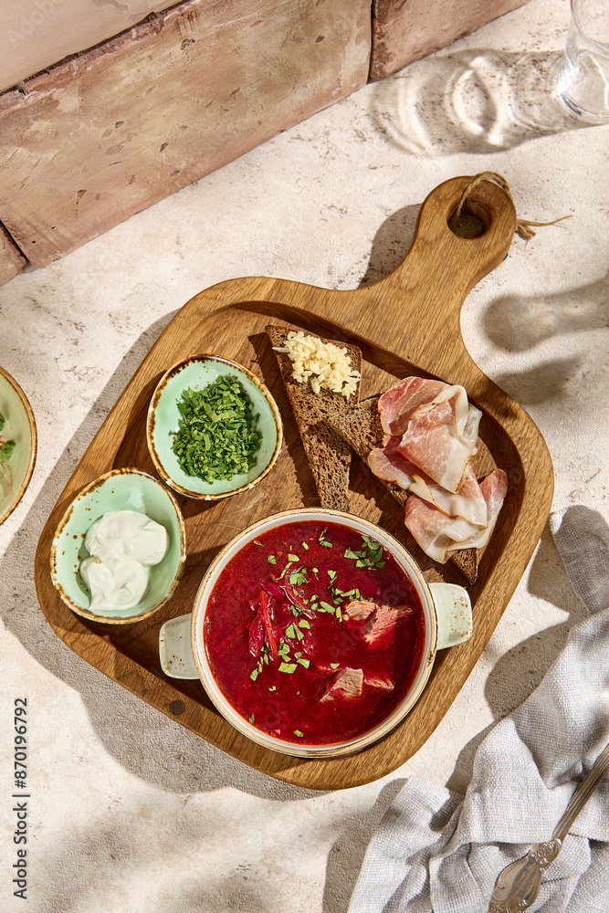 Authentic borscht with salo Sunlit Still Life Captures Rustic Aesthetic and Natural Texture