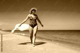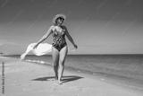 Summer vacation. Beautiful young woman in colorful swimsuit hat and sunglasses walking with a white scarf fluttering in the wind on the sandy beach on a beautiful sunny day. Front view