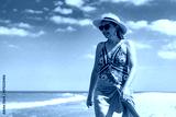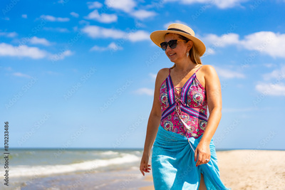 Summer vacation. Beautiful young woman in colorful swimsuit blue pareo and hat walking on the sandy beach on a beautiful sunny day. Front view