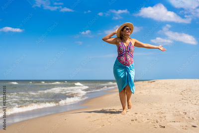 Summer vacation. Beautiful young woman in colorful swimsuit blue pareo and hat walking on the sandy beach on a beautiful sunny day. Front view