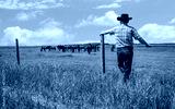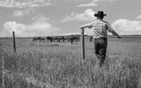 horizontal image of cowboy wearing jeans and cowboy hat stands and leans against fence in green grass and watches as his horses graze in pasture under beautiful blue sky with clouds in summer time
