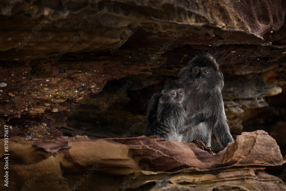 Silvered leaf monkey, Trachypithecus cristatus, monkey in the nature rock coast habitatr, Bako NP, Borneo in Malaysia.