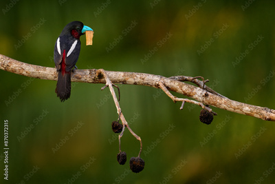 Black-and-red broadbill, Cymbirhynchus macrorhynchos, sitting on the branch with grass in the bill, nesting material. Black red bird in the nature habitat, forest, Kinabatangan river, Borneo, Malaysia