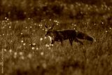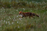 Finland wildlife. Red Fox, Vulpes vulpes, beautiful animal on green vegetation, cotton grass flower, in the forest, in the nature habitat, evening sun with nice light, Wildlife nature, Europe.