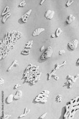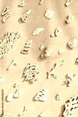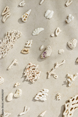 Sea shells, corals, sea stones with sun shadow at sunlight, nature photo of white shell and coral pieces scattered on light beige concrete, minimal monochrome vertical pattern, neutral pastel tones
