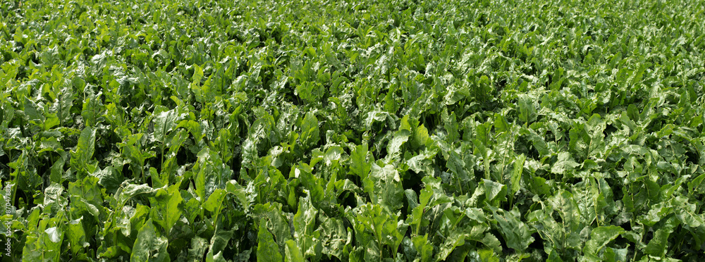 field of green sugar beet leaves close-up, horizontal view only leaves