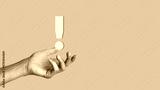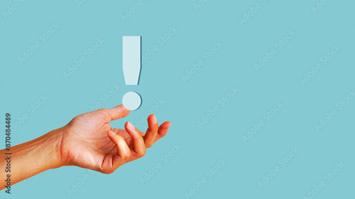 Hand shows an exclamation mark. Error warning, notification, maintenance and finding a solution. Blue background with copy space for text