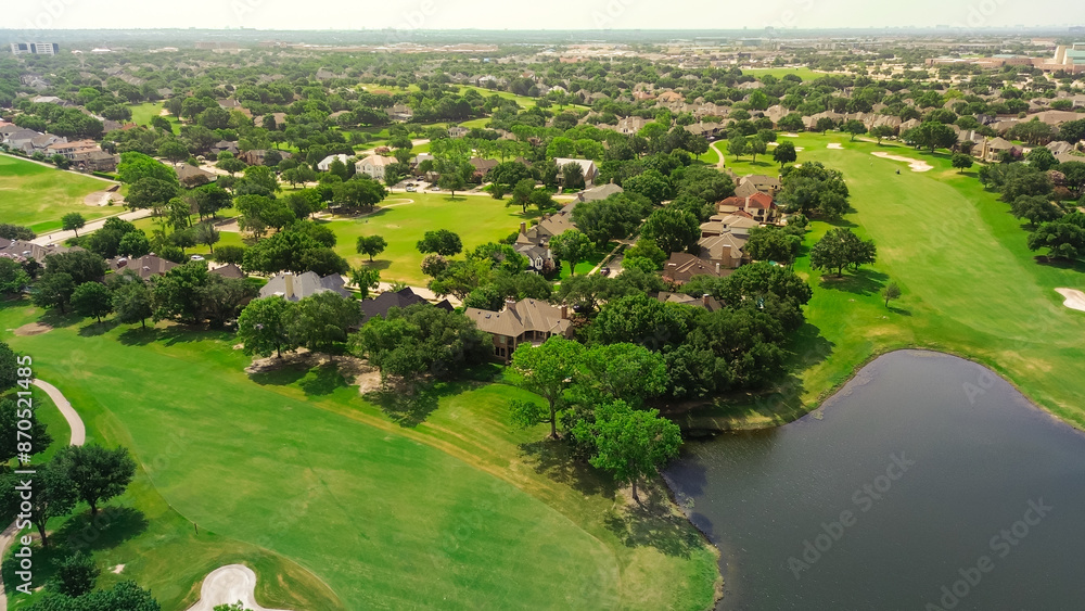 Upscale golf community in master planned subdivision urban sprawl, grassy fairway, sand trap bunkers, golfer playing with expensive new development two story mansion houses, Plano Texas, aerial