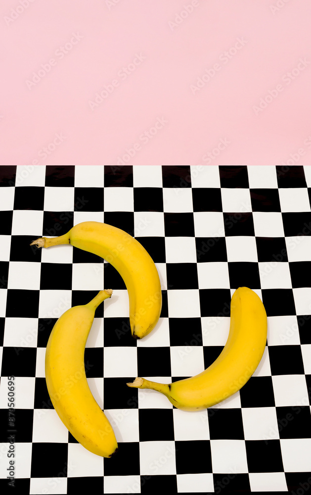 Yellow bananas lined up on a checkered black and white background. Tropical summer fruits as healthy and fresh food.