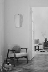 A stylish, minimalist living area featuring a mid-century modern armchair with a cozy cushion, a stack of books, and a coffee cup. The room includes elegant decor, soft lighting, and ambiance.