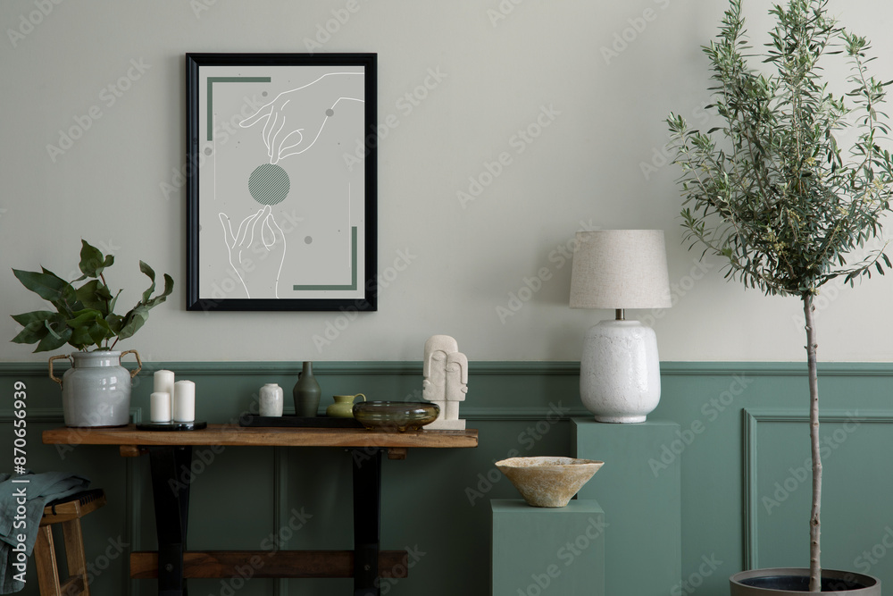 Spring composition of cozy living room interior with mock up poster frame, wooden bench, green stands, stylish lamp, beige bowl, olive tree and personal accessories. Home decor. Template.