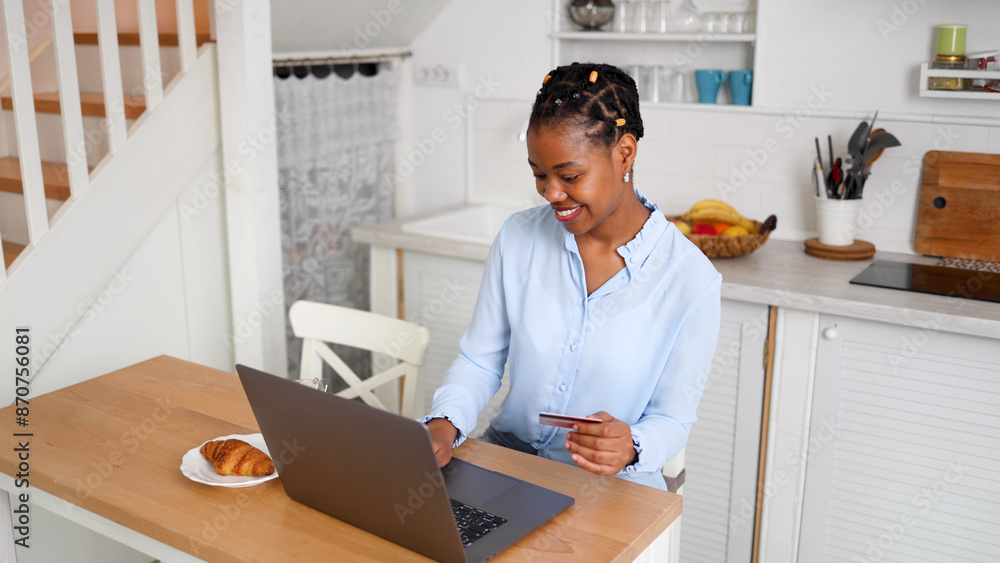 African American woman ordering products online from her house