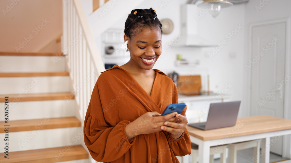 Happy African American young woman texting on her smartphone